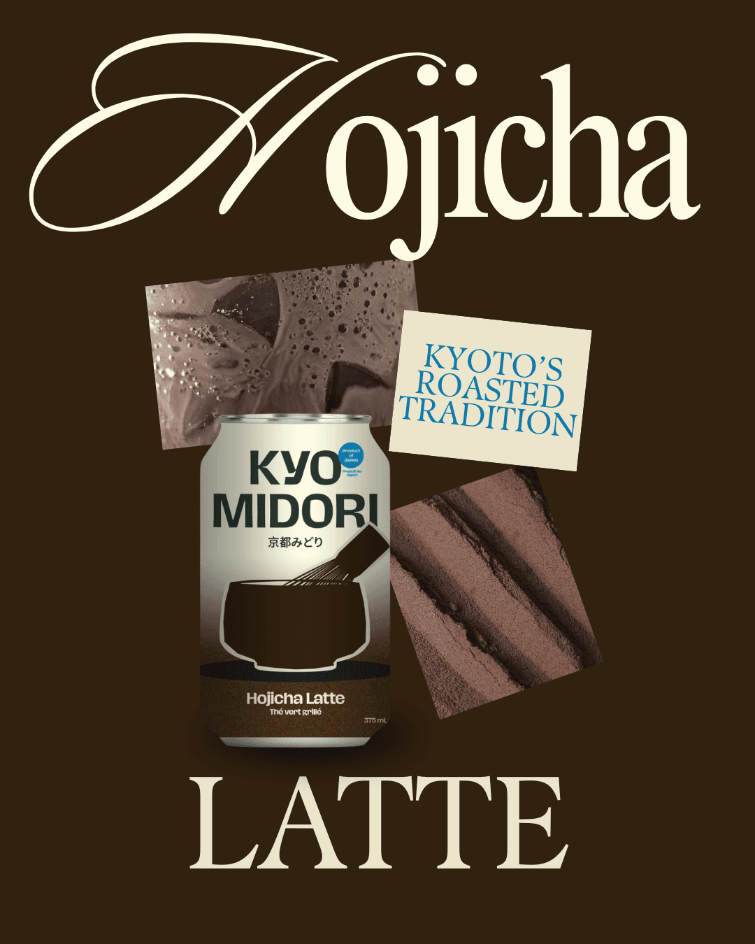 Color plays a key role in differentiating flavors while maintaining brand consistency. Deep greens represent matcha, warm roasted browns express hojicha, and seasonal editions introduce richer accent tones. A subtle grain texture is layered into the background to evoke the organic quality of tea leaves and roasted depth, adding warmth and tactility to the otherwise minimal composition.